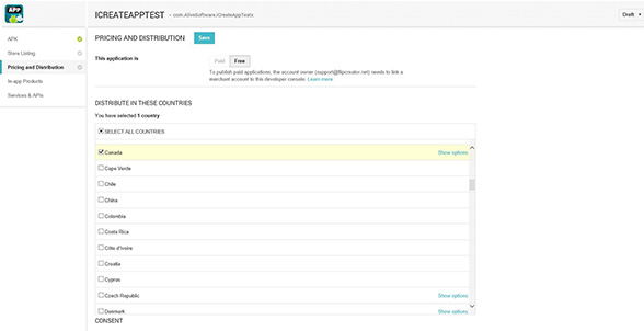 When you are done filling out the store listing page move onto Pricing and Distribution. This is the page where you choose which country you want your app to be sold in.