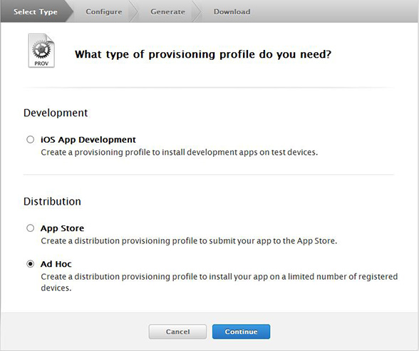 Now that you have registered your device. You now need to create a Provsioning Profile that you will be using for testing. On the left hand side of the page select "Provisioning Profiles" Select the "+" sign to create a new profile. Select "Ad Hoc" becasue you will be testing your App on registered devices.