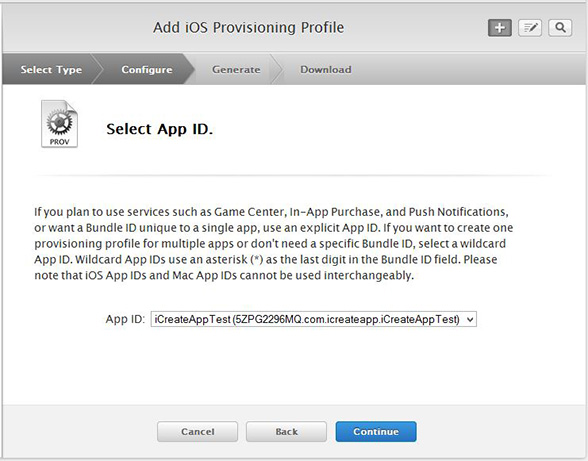 Next it will ask you to select the App ID, you need a App ID if you want to create your iOS App. Check out How to Create App ID in iOS Provisioning Portal? if you haven't already done so.