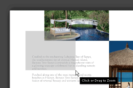 ZoomingYou can zoom in the page with the following methods: 1. Click Zoom In 2. Click on the page to zoom 3. Drag and select an area to zoom in
