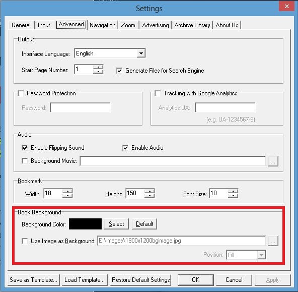 2. Under the "Advanced" tab you will see "Book Background". By default it is set to a grey background. You can change the background color to any color you want. If you want to use a image instead you can check off "Use Image as Background" then you choose the image you want and the position of the image.
